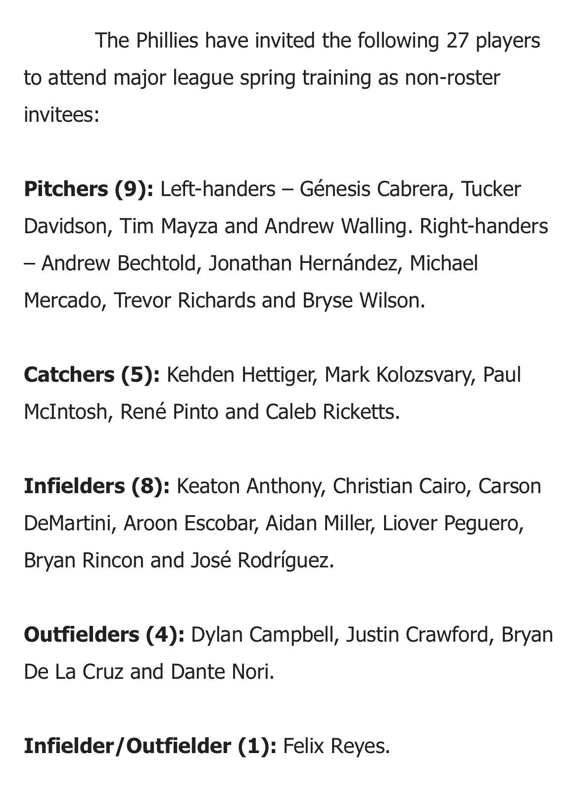 Friday, the Phillies released their list of 27 non-roster invitees to Spring Training next month in Clearwater.